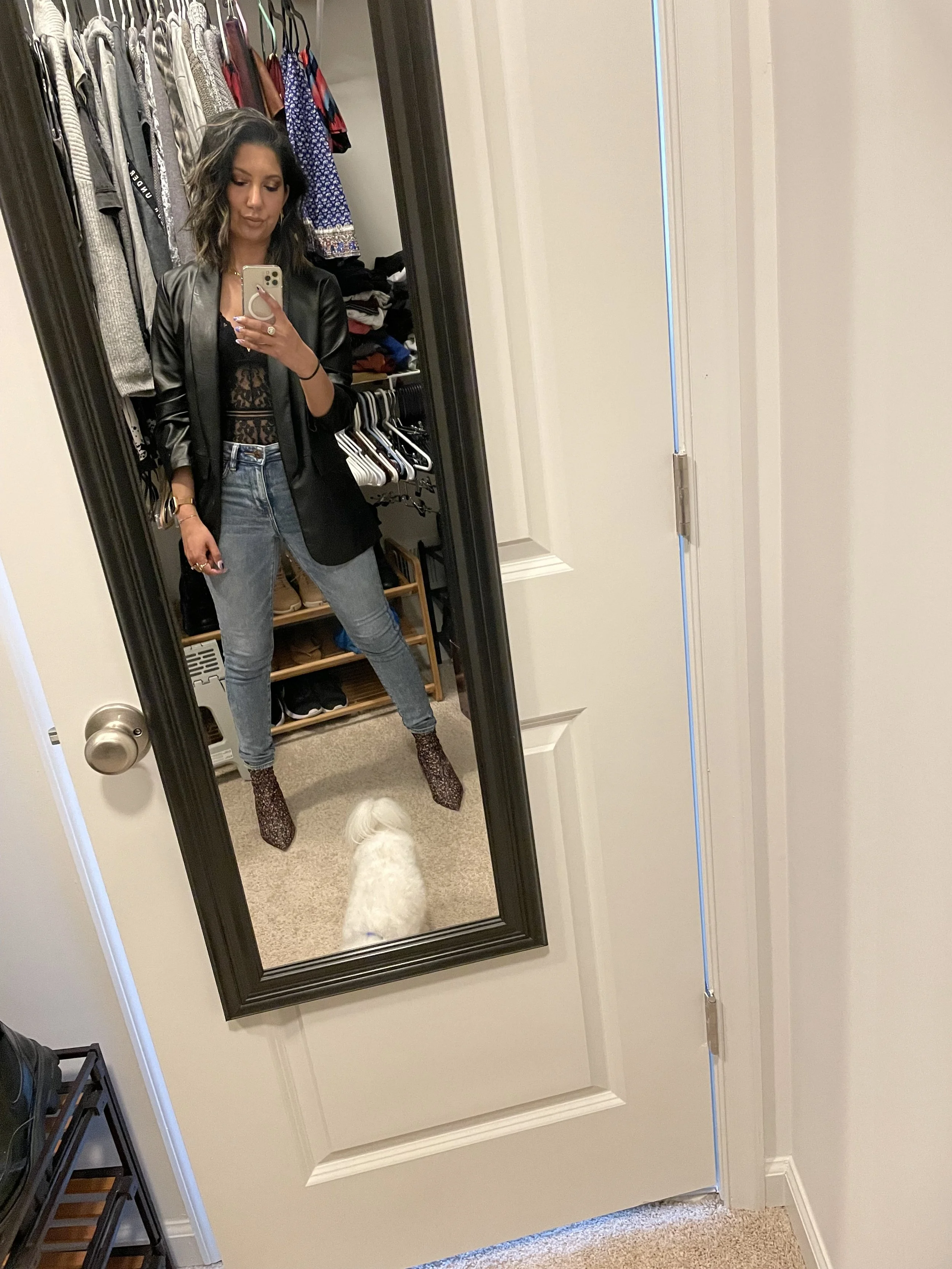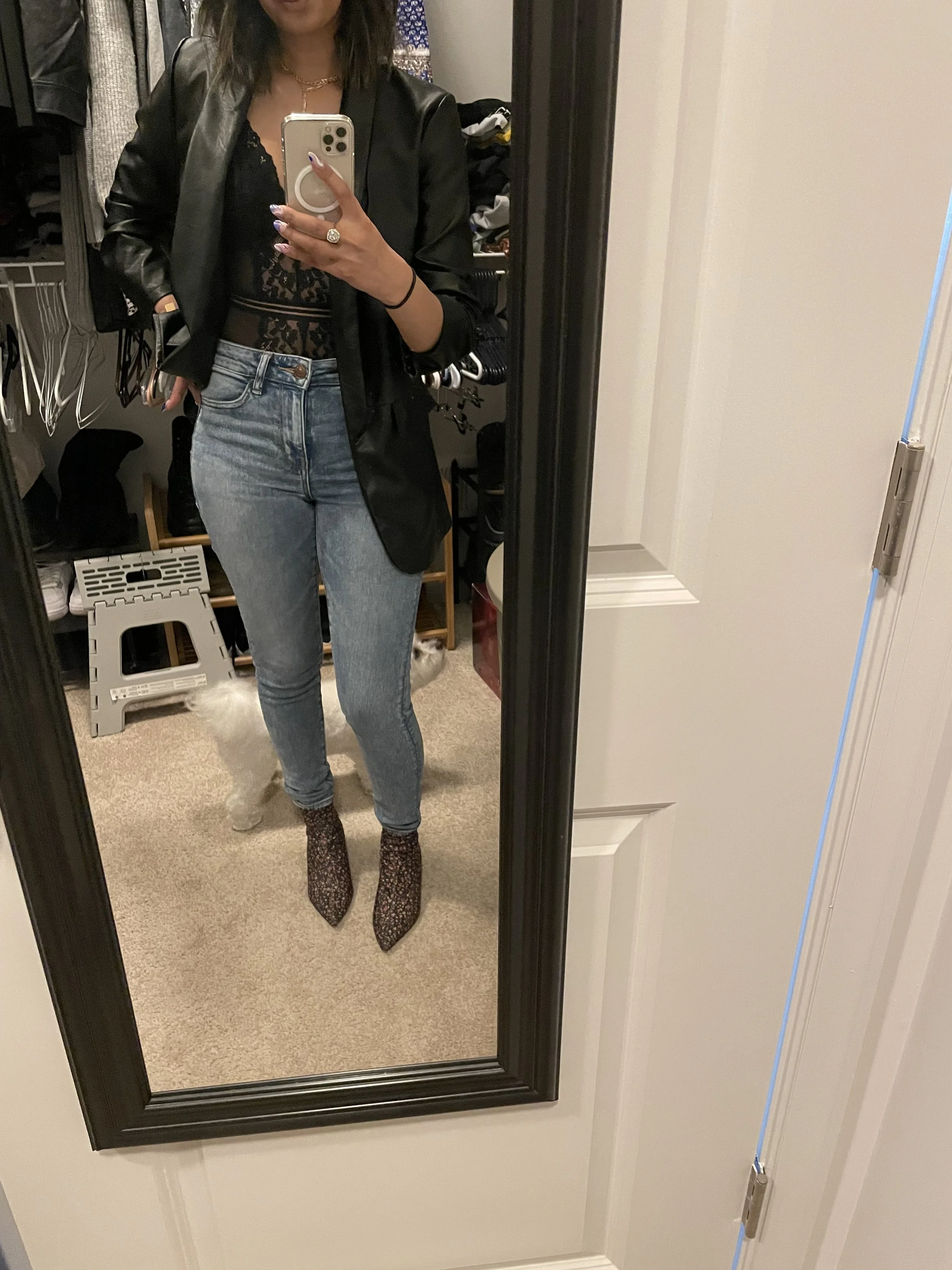 Sometimes when I want to add a little fun and flirty vibe to my outfit, I like to add a bit of lace to my look! My favorite way to add it is with a bodysuit! Throw on a blazer of any color if you’re feelin’ it! I’ve paired my lace looks with a faux leather black blazer or a simple black blazer with gold buttons,
